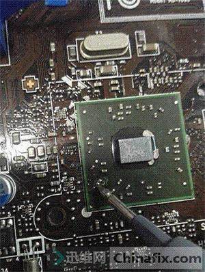 今天早上同行送來一塊微星  970A -G46 (MS7963 VER2.0)板子 說開機不顯,叫他先放下,修完液晶后一看這片板子是去年修過一片一樣型號的板子,是南橋芯片上的一個電容因長期給散熱片壓著腐掉了電容一邊造成電容漏電,一看是這樣的,直接拆掉,3.3V上來了。OK收工看圖