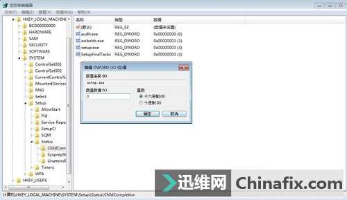 依次找到HKLOCAL MACHINE\SYSTEM\SETUP\STATUS\ChildCompletion把setup.exe的值從1改成3,然后關掉注冊表和命令窗,點錯誤窗口的確定,重啟。重啟能進入系統的話那就沒問題了,如果還是一樣報錯的話那就得用大招了。