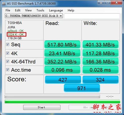 一般可以使用AS SSD Benchmark這款軟件來查看,如上圖紅框所示,如果在1024,2048之類的數字后面帶有OK的字樣,說明SSD已經4K對齊。如果沒有OK的字樣,說明4K沒有對齊。如果OK前面的數字非常的大,并不是1024,2048之類的數字,則說明在安裝操作系統時,硬盤劃分了隱藏分區。