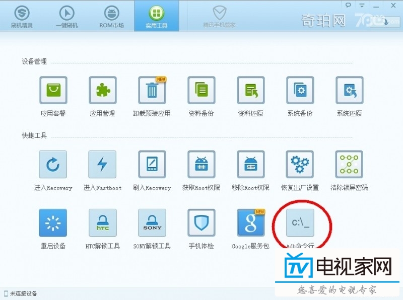 首先下載刷機(jī)精靈(或者類似的刷機(jī)軟件)然后盒子連接電腦(具體連接步驟看),待刷機(jī)精靈識(shí)別后,打開 “ADB命令行” 功能,
