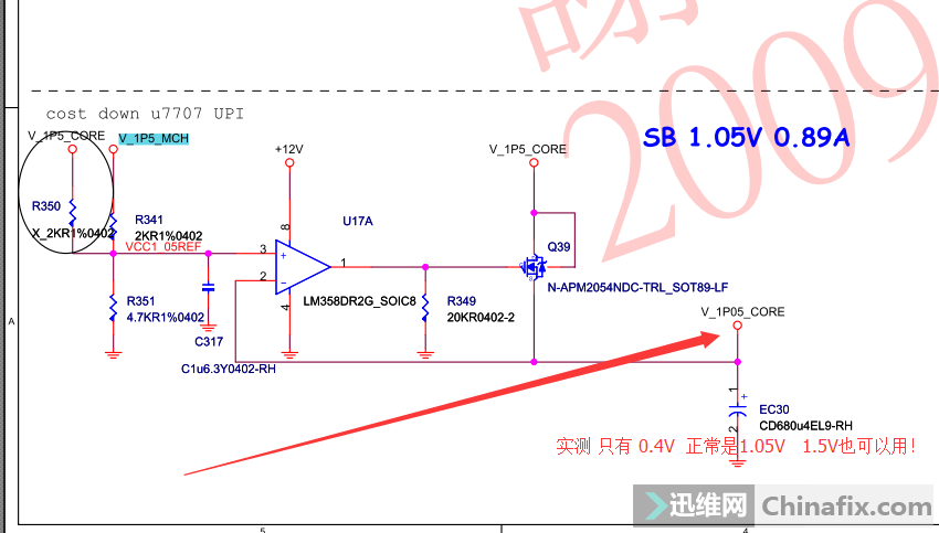 版號: MS-7592 VER 5.2 故障: 復位不跑碼! 測各大供電 都有! 時鐘 復位 也有;就是不跑碼! 直接測Q39 S級 只有0.4V 太低了 正常1.05V! 一坨錫 短接DS ! 跑碼 亮機! 這是、經驗 修十幾片了! 總結: 一般都是 前級 運算放大器 正向輸入端 電壓 不夠 導致的 ;可能是電阻變值 也可能是 產生基準電壓的小芯片 壞了 ! 個人認為維修就應該 這樣 ;高效 便捷!