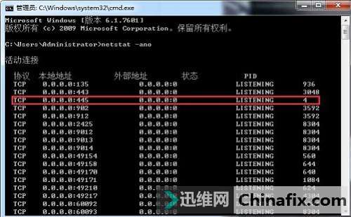 3、點擊回車后,顯示出一大段文字,找到 "本地地址" 為 0.0.0.0:80 的一行,在行的最后我們會看到 PID為"4",記住此PID。