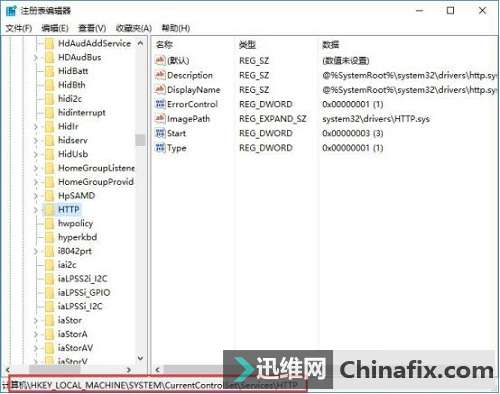 4、調(diào)出注冊表編輯器后,依次展開至HKEY_LOCAL_MACHINE/SYSTEM/CurrentControlSet/Services/HTTP,如圖: