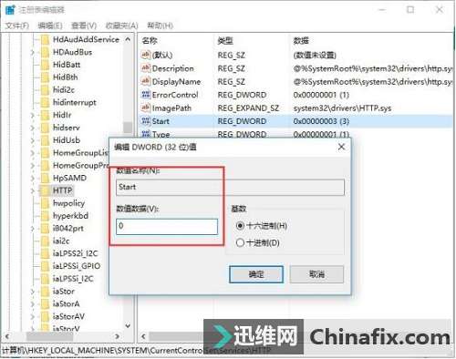 5、接著在選中HTTP,選中之后,我們就會看到右邊有一個Strart文件,然后雙擊,將其數(shù)據(jù)值修改為“0”。