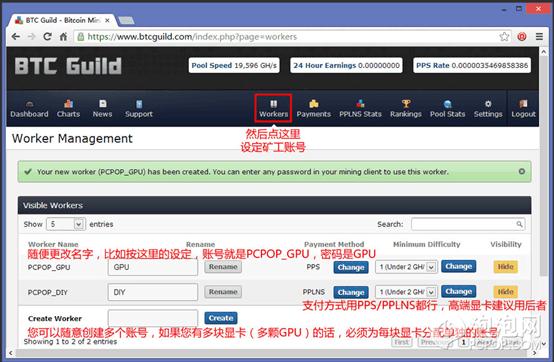然后就是最重要的礦工賬號(hào)設(shè)置了,礦工顯然指的就是CPU或者GPU,您需要為每一個(gè)CPU或GPU設(shè)定一個(gè)賬號(hào),假設(shè)您有兩塊HD7990,就需要為4顆GPU設(shè)定4個(gè)不同的賬號(hào)