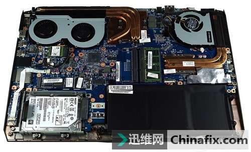 這款筆記本散熱模塊參考上面的z7就比較好分析了,CPU和顯卡部分共用了兩根熱管(一根8mm一根6mm),通過兩個小尺寸多扇葉風扇散熱,顯卡部分覆蓋GPU核心、顯存和部分電感,同樣串聯的風扇使末端散熱鰭片面積較大。因為將CPU和顯卡串聯,所以熱管長度很長,在CPU單獨負載時散熱效果還是可以的,但是雙烤的話二者會互相影響,最終效果可能會不盡人意。