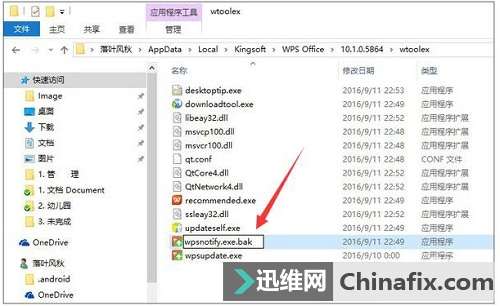 首先將原有的“wpsnotify.exe”改名,后綴加上“.bak”進行備份(即新文件名為“wpsnotify.exe.bak”)。