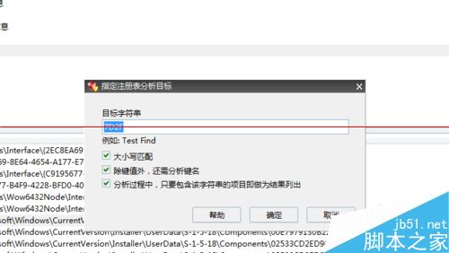 2、先說說找不到或者不知道有沒有找全這種情況。這里我利用的是優(yōu)化大師的注冊信息清理里面的查找目標(biāo)這個功能,其實(shí)也可以直接用注冊表自帶的搜索功能,但是它只能找完一個再進(jìn)行下一個搜索。這里我們在目標(biāo)字符串框填“7D2F”,把下面 大小寫匹配等三個框框都勾選,然后點(diǎn)擊確定進(jìn)行搜索。