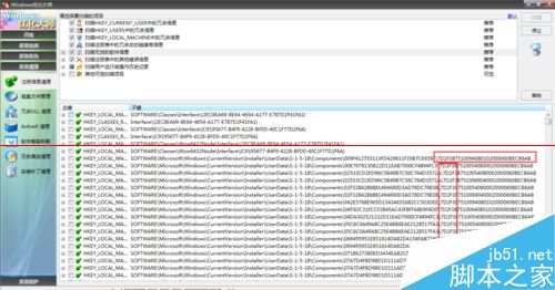 3、全部帶有7D2F的都搜索出來了,注意辨別,比如說下圖前面那幾個7D2F位于字符串中間的就不是了,不要勿刪。接著要做的是,把/7D2F...開頭的鍵值進(jìn)行刪除。小編也曾天真的以為直接用該軟件全選,然后刪除就成了,結(jié)果反復(fù)刪除幾小時后才發(fā)現(xiàn),對于很多注冊信息,大師也是沒有刪除權(quán)限的。也就是說,我們依舊得進(jìn)入注冊表,進(jìn)行手動一個個刪除。