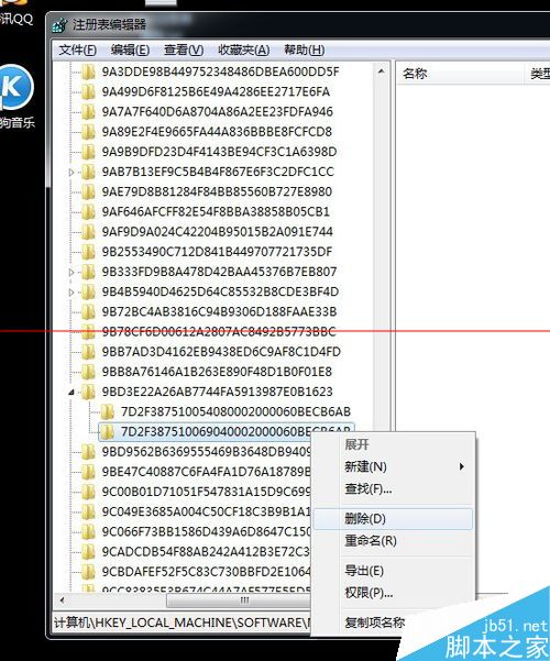 1、我們知道,主要就是要刪除7D2F開頭的鍵值,但是有時候找不到這些鍵值在哪,或者說不知道有沒有找全,還有一種是找到了卻拒絕訪問,無法刪除。(注意:注冊表的刪除有風(fēng)險,請記得提前備份,防止勿刪。)