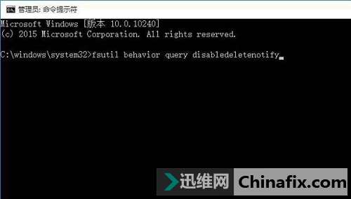(2)點擊彈出管理員命令提示符后,在上面輸入 fsutil behavior query disabledeletenotify 并按回車。
