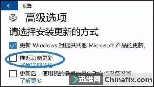 實現(xiàn)過程很簡單:在Win10系統(tǒng)界面左小角的Cortana對話框里輸入“更新”二字并敲轉(zhuǎn)行鍵,打開“設(shè)置”對話框的更新選項,然后選擇右側(cè)下部的“高級選項”,在新彈出的對話框中勾選“推遲功能更新”就能讓系統(tǒng)暫停更新了(安全更新不受影響)!