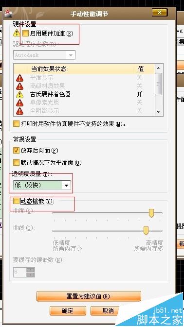 3、還是在性能面板,右邊,打開硬件加速“手動調節”,將手動調節勾去掉,下面照圖做:
