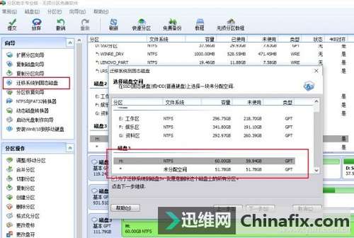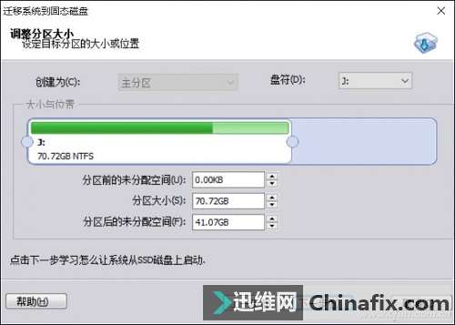 在主界面點擊左側功能列表中的“遷徙系統到固態硬盤”選項,然后在彈出的磁盤選擇窗口中選擇移動硬盤對應的盤符,接下來會進入調整目標分區大小的窗口,一般選擇默認即可。