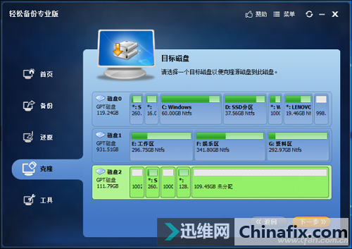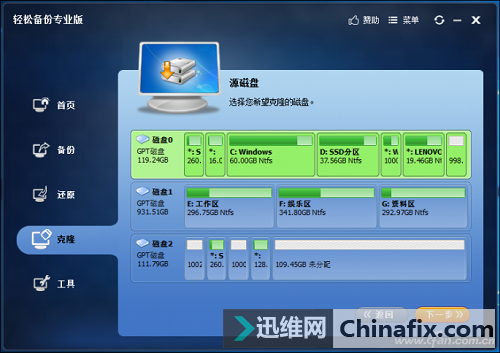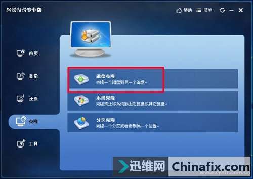 如果你新買的SSD容量大于或等于老硬盤,那小編則建議大家使用硬盤克隆的方式,實現老硬盤整體數據的遷徙,包括所有分區、隱藏分區、恢復分區等所有的數據。還是按照上面的方式將新硬盤與筆記本相連,然后下載安裝并運行“輕松備份專業版”。