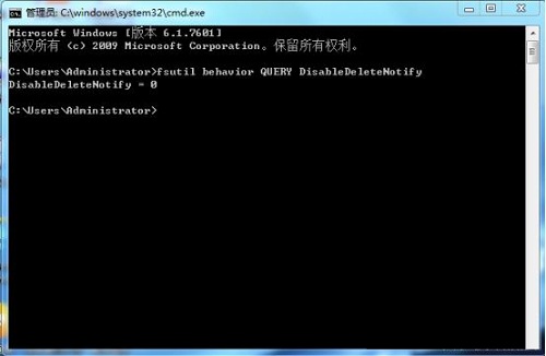 以管理員身份運行CMD,輸入fsutil behavior query disabledeletenotify,按ENTER執行命令。下行顯示Disabledeletenotify=0表示TRIM為開啟狀態,disabledeletenotify=1表示,TRIM為關閉狀態。