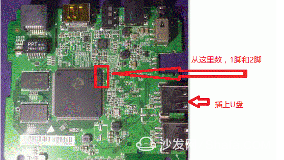第三步:盒子電源接好,盒子電源開關默認關閉,AV線或者HDMI連接好盒子和電視。插上U盤(看圖片,不要插錯了)。