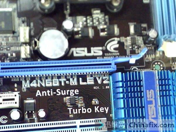 主板維修 板號:m4n68t-mlev2 故障:三塊板,1.開機幾秒掉電 2.時跑碼時不跑碼 3.自動上電不跑碼 故障維修:1.開機幾秒掉電,測開關角1.幾v,不正常,應為3.3v,通過電位圖找到相應的點和元件。測到822排阻壞,換掉ok。
