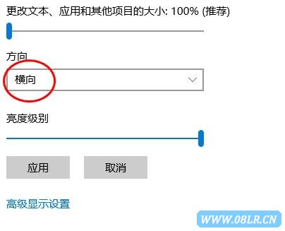2、在右側(cè) 方向下拉菜單中選擇 【橫向】 點擊 【應(yīng)用】 -- 保留更改 屏幕即可變正常!
