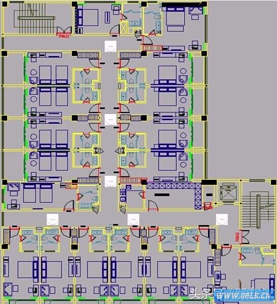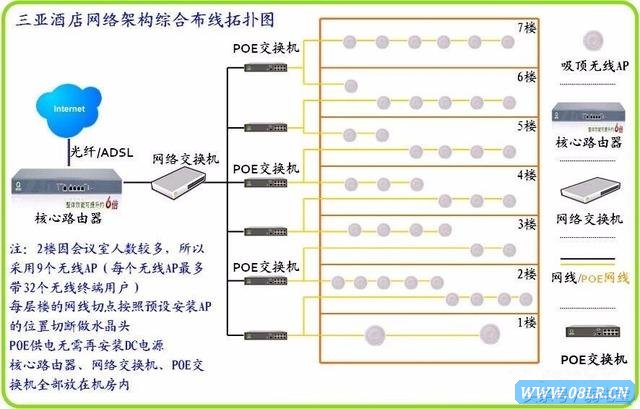 1、機房核心路由器下接網絡交換機和POE交換機,網絡交換機到每個房間的有線網絡,POE交換機到每個無線AP實現POE供電,無線AP安裝在走廊天花板上,POE供電,大大減少方案成本及穩定性,每個AP覆蓋4-8個房間(根據布局和面積而定),無線傳輸速率300M,由于樓層分為7層,由酒店布局來看,大堂需要裝2臺無線AP、2樓會議室及餐廳另有部分客房一共需要安裝9臺無線AP,3樓和4樓布局一樣呈T字型 房間格局較深因此3樓和4樓分別每層安裝6臺無線AP,5樓、6樓、7樓布局一樣 均為客房呈T字型 每層安裝6臺無線AP,因此覆蓋整個酒店105間客房、會議室、大堂、辦公區、餐廳、休息娛樂區總共只需要安裝41臺無線AP即可覆蓋整個酒店。