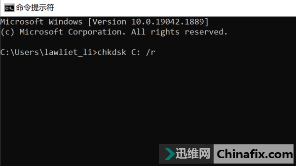 但是如果想掃描驅動器,定位壞扇區,恢復可讀信息,應該輸入:chkdsk,空格,驅動器的字母,冒號,空格,/,參數“r”然后按回車鍵。同樣以C盤為例,如下圖: