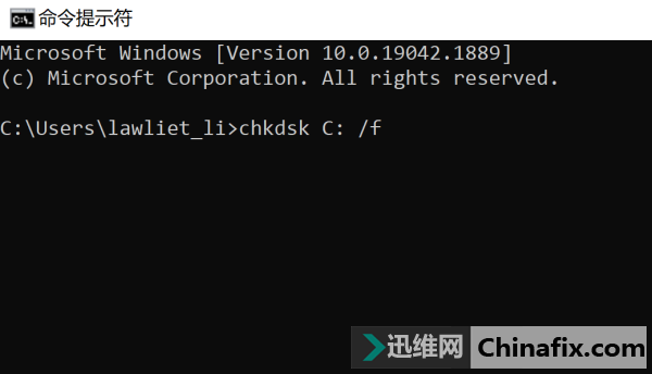 要進行掃描并進行修復,請輸入:chkdsk,然后輸入一個空格,然后是驅動器號,冒號,再次輸入一個空格,/,參數“f”,然后按回車鍵。如下圖(以C盤為例):