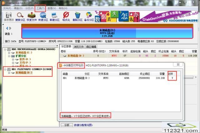 打開DiskGenius,選中固態硬盤,點擊“工具”欄目,再選中4KB扇區對齊檢測,接著會彈出固態硬件檢測的窗口,我們只需要看下“對齊”下面是否顯示的為Y,如果不是則說明沒有對齊。