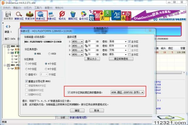 打開DiskGenius,直接點擊“快速分區”會彈出快速分區窗口,在右側我們可以看到“對齊分區到次扇區的整數倍:4096扇區”,大家只需勾選,然后選擇4096扇區就可以了!