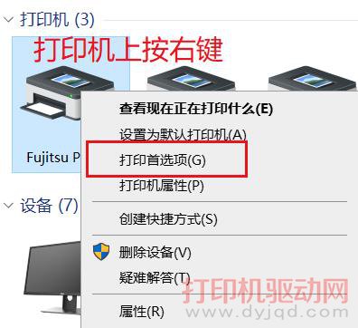 1.在打印機上按右鍵,選“打印首選項”