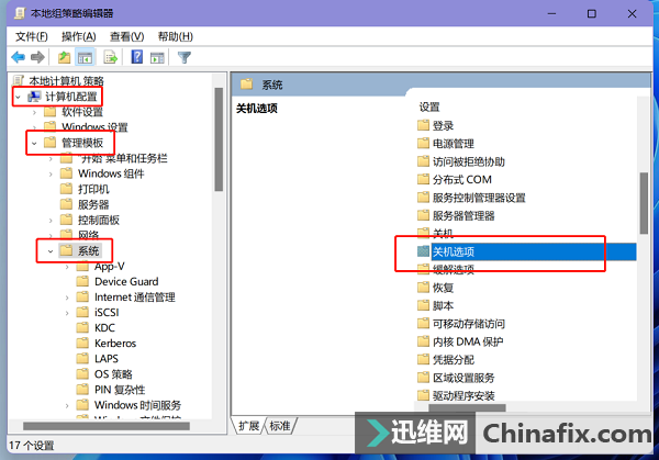 2、在進入的本地策略編輯器當中,左側菜單欄里選擇【計算機配置】-【管理模板】-【系統】,然后鼠標移動右側,下滑找到并雙擊【關機選項】;