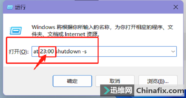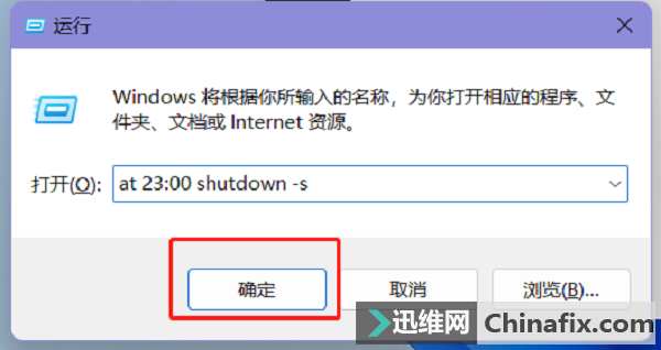 2、接著我們在框里輸入一串命令,假設我們要在23:00關機,就輸入【at 23:00 shutdown -s】,如果要在19:00關機的話,那就把23:00改為19:00,以此類推,大家可以結合自己的實際情況和需求設置時間。