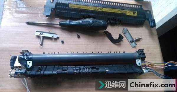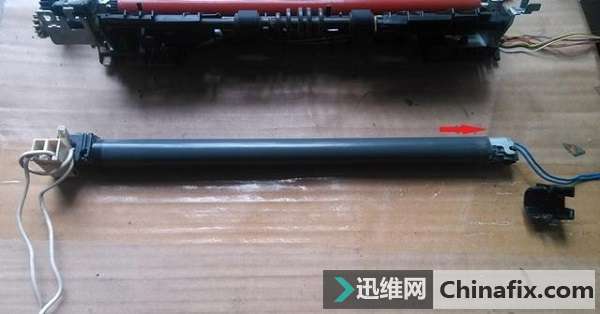 拆出加熱輥。用手轉動定影膜,發現轉不動。里面沒有潤滑脂了。