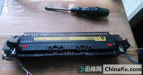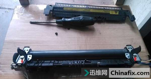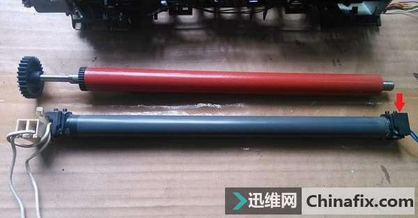 拆出定影輥,發現齒輪橡皮圈沒有壞,把它再安裝回去。把箭頭處的塑料塊拆下,左右搖晃往外拔就可以了。