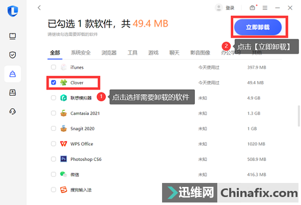 步驟2:找到需要卸載的軟件,點(diǎn)擊勾選后,接著點(diǎn)擊【立即卸載】,即可完成卸載。
