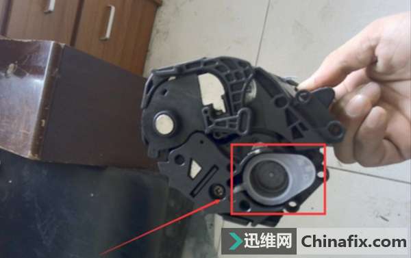 3、取出碳粉盒以后、先用小刀打開這個蓋子、把殘留的費(fèi)碳粉清理出去。