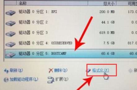 6、保持默認設置到圖示界面,選中“boot camp”分區,并“格式化”