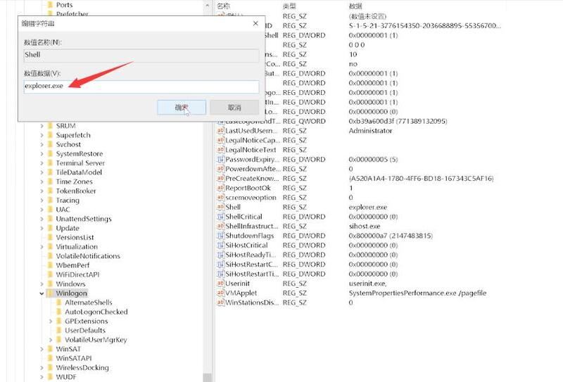 4.將數值數據改為explorer.exe,點擊確定,再重啟電腦即可恢復正常